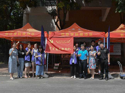 在这特别的日子里,蒋盛益院长、朱珍葶书记也第一时间来到迎新队伍之中,慰问各位新生并指导志愿者的工作。上午蒋院长、朱书记带队检查了学院的新生注册工作,并强调应在确保疫情防控的大环境下做好新生服务工作。随后,一行人深入新生宿舍,与刚入校的新生交流,了解同学们的思想和动态,勉励新生尽快实现身份转变,科学规划好大学生活。蒋院长和朱书记还慰问了信息学院在新生入校点服务的志愿者们,并对炎炎烈日下辛勤忙碌的志愿者们给予了高度赞扬。学生家长们也对学院志愿者们的热心帮助给予了高度肯定,表示志愿者们帮了很大的忙,让家长和孩子们如同是到了另一个家般亲切温暖。