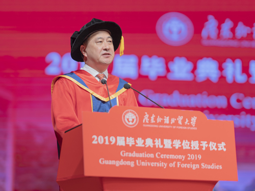 本网讯 2019年6月28日上午,广东外语外贸大学(以下简称广外)金融学院、英语教育学院和信息科学与技术学院2019届毕业典礼暨学位授予仪式在大会堂隆重举行。出席本次毕业典礼的领导和嘉宾有:广东外语外贸大学党委书记隋广军教授、副校长焦方太、王廷惠、刘建达教授,导师代表金融学院易行健教授、杨菁菁教授、贺显南教授、姚海洋教授,英语教育学院董金伟教授、吴岩教授、权立宏教授,信息科学与技术学院蒋盛益教授、李霞教授、龚永义教授、刘景发教授。副校长王廷惠教授主持本次仪式。