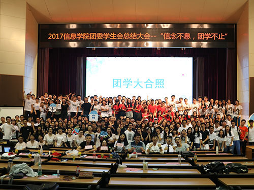 本网讯 5月21号,广东外语外贸大学信息科学与技术学院团委学生会总结大会在B8学术报告厅隆重举行,团委书记谢石顺,团委副书记林子淮,学生会主席刘佳欣,副主席谢勇生、李威、周舟,秘书长陈钟南等嘉宾出席了本次总结会。(以下“团委学生会”简称“团学”)