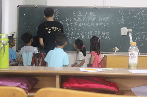 “密室逃脱”也是人气最高的游戏之一,在教室门口排队的学生多达二十多人。游戏中,同学们通过寻找老师藏好在教室中的线索一步一步得推断出答案。游戏设计的难度适合学生们的水平,由于灵活多变,还是难倒了不少小朋友。但依然有同学充分运用自己的聪明才智,完成了所有关卡。这项游戏对他们来说充满了挑战的同时,也充分抓住了他们的好奇心。