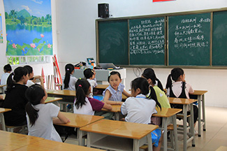 移步外语课室外则又是另外一番景象——学生正在用英语进行着自我介绍,有些学生的语句并不是那么流畅,红彤彤的脸蛋和紧皱的眉毛无不透露着紧张和不安,但最终在曾获和张贺雪两位老师的引导下都一一完成了自我介绍。外语不似汉语亲切,零零星星的一个个字母拼凑出了一句话或是一个句子,对于小学生来说,在学英语不仅要注重单词、语法等硬性要求,更重要是激起他们学习一门陌生语言的兴趣。曾获和张贺雪老师通过给他们看有趣的英语电影视频,教授英语绕口令等方法,来进行对单词、句子和语法的学习。特色外语课程旨在摆脱机械式的死记硬背,在教学的过程中创造性地设计贴近学生实际生活的场景,提高他们的学习兴趣,使他们能够积极参与到英语学习活动中。