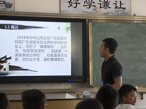 上午,由逐光盛夏服务队队长莫广智所带来的黄埔军校爱国主义历史课,受到学生们的欢迎。莫广智从黄埔军校的起源讲起,从其成立的背景原因到建立者,并在讲授当中穿插实际例子,让学生沉迷在黄埔军校的历史之中。而一句“黄埔四巨头,三杰,四凶,五虎将,八大金刚,十三太保,一百零八将。”则充分调动起了课堂的气氛。在这些黄埔军校杰出人物中,莫广智主要介绍了国父孙中山先生,并通过讲解孙中山先生如何推翻清朝政府统治的实际事例,将孙中山先生的伟人形象鲜活地展示在学生面前。同时,莫广智通过讲述中国共产党在黄埔军校和对中国的影响,传达了如今的和平时代的来之不易,使爱国主义的种子深深地种在学生们的心里。