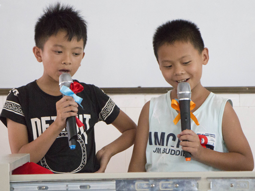 本网讯 2017年7月12日下午,由广东外语外贸大学逐光盛夏服务队组织举行的“肇庆好声音”歌唱比赛在肇庆怀集县梁村镇中心小学阶梯教室举行。本次比赛由逐光盛夏服务队队员方恒彬、郑方形、陈健林和肖韬担任评委。这次歌唱比赛参与度极高,报名参加比赛的小朋友有近七十位。