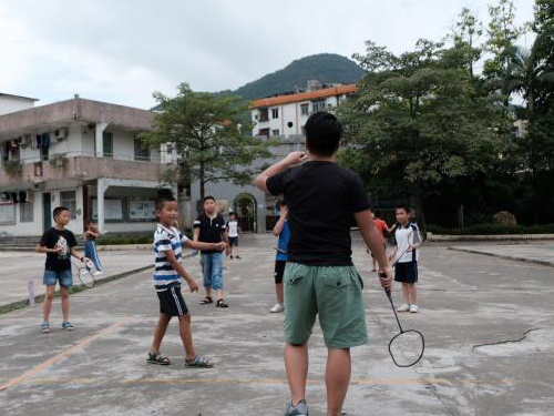 义教组仍然在上课,经过这么多天的磨合,老师们在上课时无疑更得心应手。今天的体育课是羽毛球课,由张松波老师给小朋友们上课。张松波老师先给小朋友们讲解了羽毛球的发球和击球的几种方法,亲自示范了一遍,然后带着小朋友们一起练习几遍。时间过半,接下来便是自由活动。小朋友们自己分组打球,有的人以前学过,打得有模有样;有的现学现练,也有一番趣味。今天天气并不炎热,小朋友们在操场上尽情的挥洒汗水,下课时都有些意犹未尽。