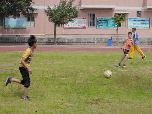 今日义教依旧是美术班、剪纸班、音乐班、手语操班和足球班。小朋友们凭着自己对兴趣爱好的强烈热情心,在这么热的天坚持出席,认真听讲和学习。学美术和学足球的人数是最多的,前者多数是小女孩,而后者则有两个女孩,其余全是爱运动的小男孩。美术课一开始两位小老师先让他们玩击鼓传花的小游戏,抽到了则上讲台自我介绍,让他们更能彼此熟悉,也活跃了课堂的氛围。然而小朋友们都有点腼腆,音量小得要凑在他们嘴边才听得清他们说的话。所以小老师们改变了计划,让没抽中的同学也轮流站起来自我介绍,锻炼他们的勇气。走到像底下摆了个大火炉的足球场,小男孩们即使汗流浃背依旧在草地上欢快地踢着足球。在今天还举行了一场小型的足球赛,但可能因为两队小朋友的年龄及其他因素的分配不均匀,有一队打到半场就认输了,有点可惜。