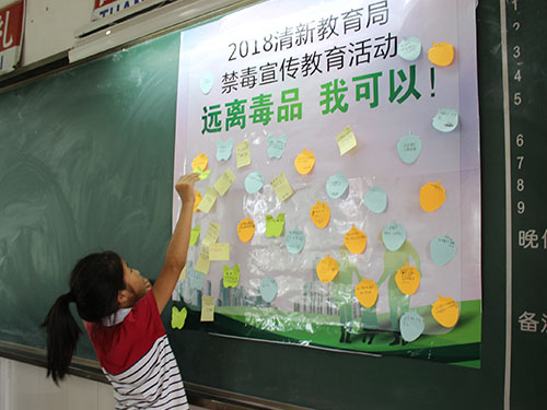 心理辅导活动接近尾声,李林珍老师让同学们在便利贴上写上自己抵抗毒品的决心,把自己的便利贴贴到黑板的广告纸上。这一互动活动不仅让同学们将自己的感想变为文字分享给大家,而且让同学们对毒品知识有所收获与总结。