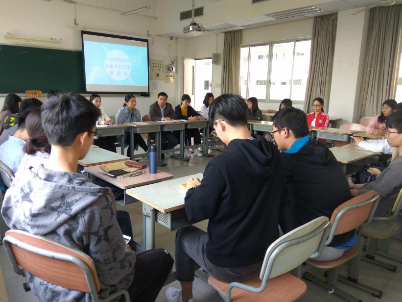 本网讯3月22日,广东外语外贸大学信息科学与技术学院“2017级领航学长代表座谈会”在教学楼G309顺利召开。信息科学与技术学院(以下简称“信息学院”)党委副书记麦培年、2017级辅导员董婷、张文萃及二十位优秀的领航学长聚集一起,共同探讨如何更好的发挥优秀学长的传帮带作用,在思想、品德上引领17级学生。
