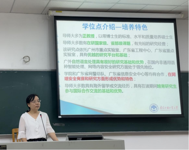 会议伊始,肖锋副书记介绍了信息学院近年来国内升学情况,分析了当前考研形势,鼓励同学们尽早开始复习。紧接着,李霞副院长为同学们做了以“信息学院研究生培养”为主题的分享,并结合自己多年来在广外教育行业的工作经历和感悟,从信息学院硕士研究生学位点情况、信息学院研究生培养情况和广外研究生奖学金政策三个方面展开本场分享,李霞副院长向同学们提供了两点建议:对于报考广外的同学们要认真复习,尤其抓好数学的复习;对于考研的同学们需要把握好心态,认清自己想要的,把握当前的考验局势,找准学校,找准导师,提高命中率。