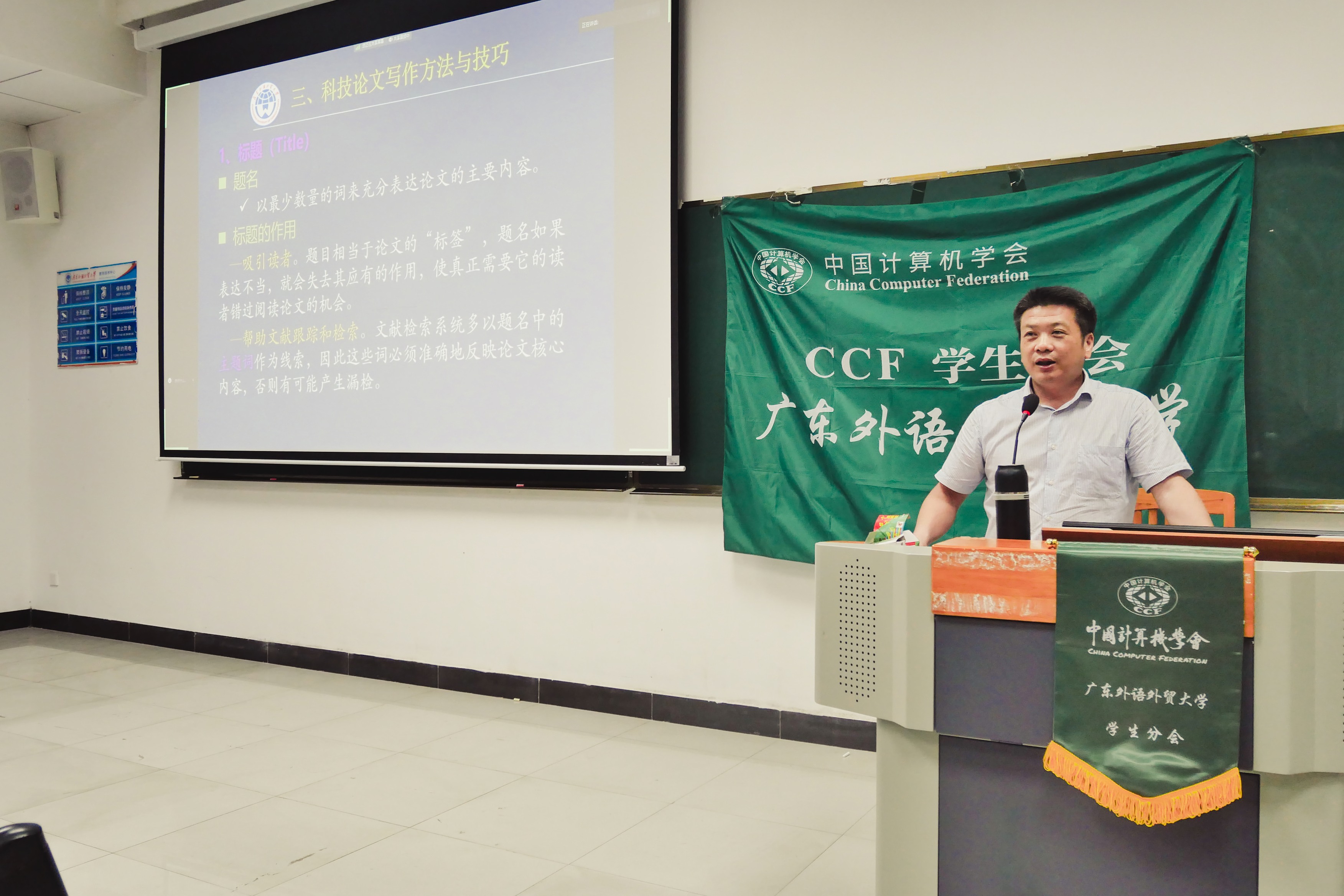 选举之后,广东外语外贸大学信息科学与技术学院刘景发教授为同学们带来题为“学术论文写作方法和技巧”的精彩讲座,从学术论文写作的目的、学术论文如何选题以及科技学术论文的写作方法与技巧三个方面为同学们做出详细介绍。