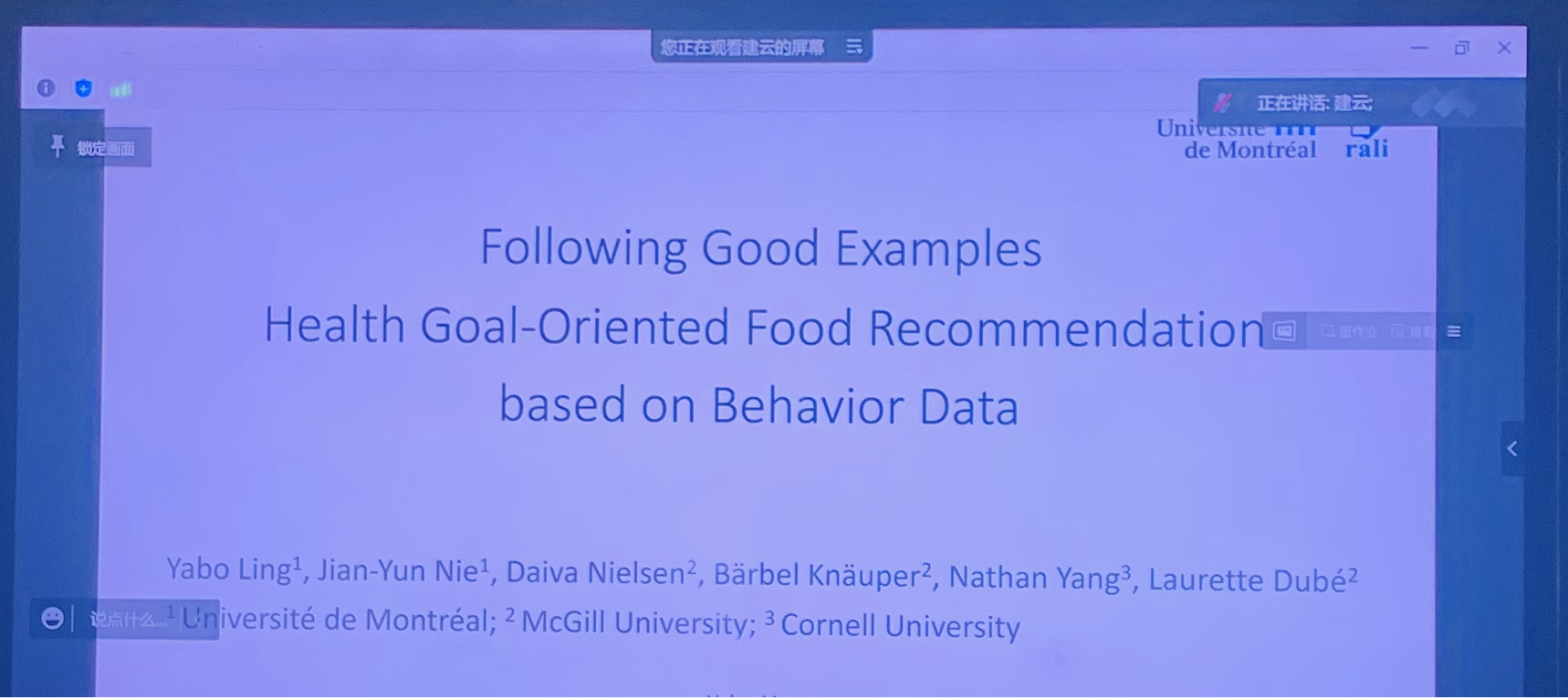 聂建云教授首先以“Following Good Examples - Health Goal-Oriented Food Recommendation based on Behavior Data”为题为大家介绍他与团队最新的研究成果,该工作旨在通过设计食物推荐模型,进而帮助用户实现体重控制。传统的食物推荐方法结合用户偏好以及营养学家提供的营养计划进行推荐,但是这些营养计划过于刻板,用户可能难以遵守。因此聂教授团队从用户偏好和他人成功的样例相结合的角度出发,通过分析和模仿用户的过往行为作出推荐,并结合了卡路里摄入量、BMI指数等指标,为用户推荐可参考的食物清单。在报告中,聂教授详细为大家介绍了这个推荐模型的工作目标、构建思路、数据采集过程、测试结果等。