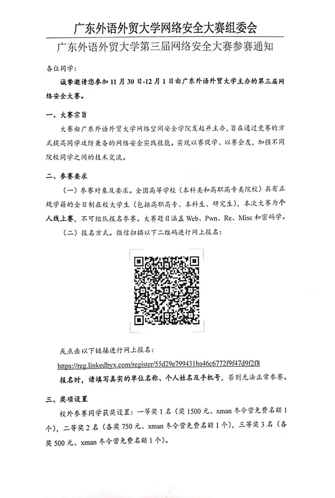 诚挚邀请您参加11月30日-12月1日由广东外语外贸大学主办的第三届网络安全大赛。