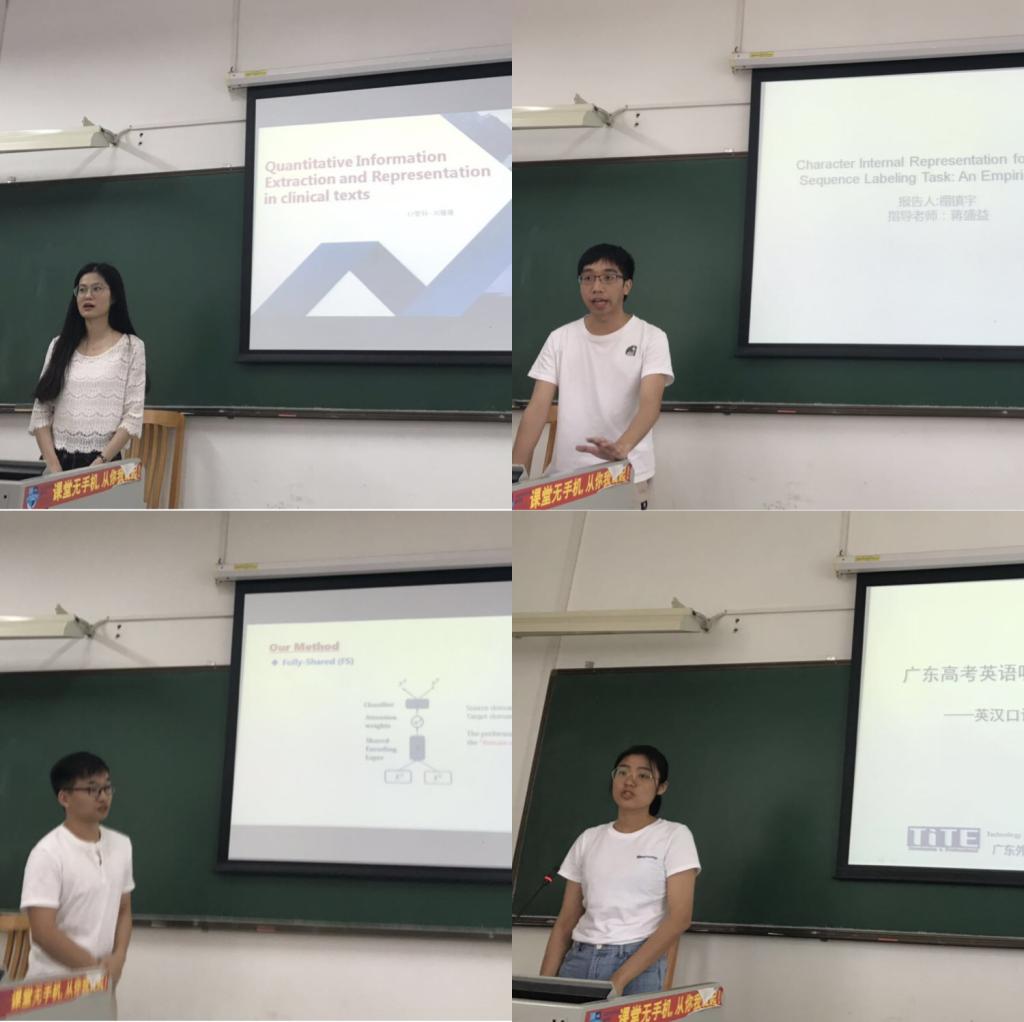 论坛学术报告中,刘珊珊同学、曹子旋同学、禤镇宇同学、龙晓岚同学等就他们正在研究的工作进行了汇报和讨论。如刘珊珊同学就“中文电子病历中信息抽取的方法研究”进行了汇报、曹子旋同学就“基于对抗迁移学习的细粒度学习”展开汇报、禤镇宇同学则就其正在研究的“汉字内部表示在序列标注任务中的实证研究”进行了相关汇报。