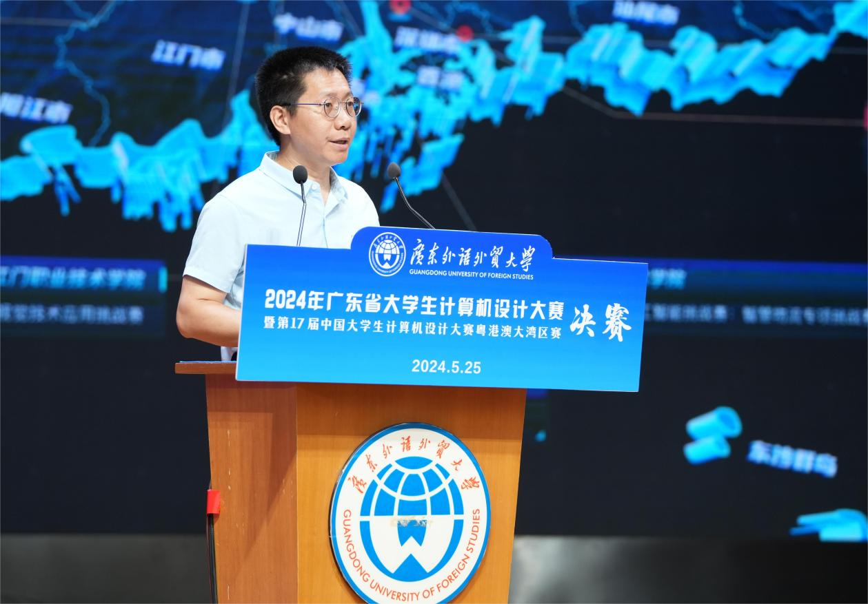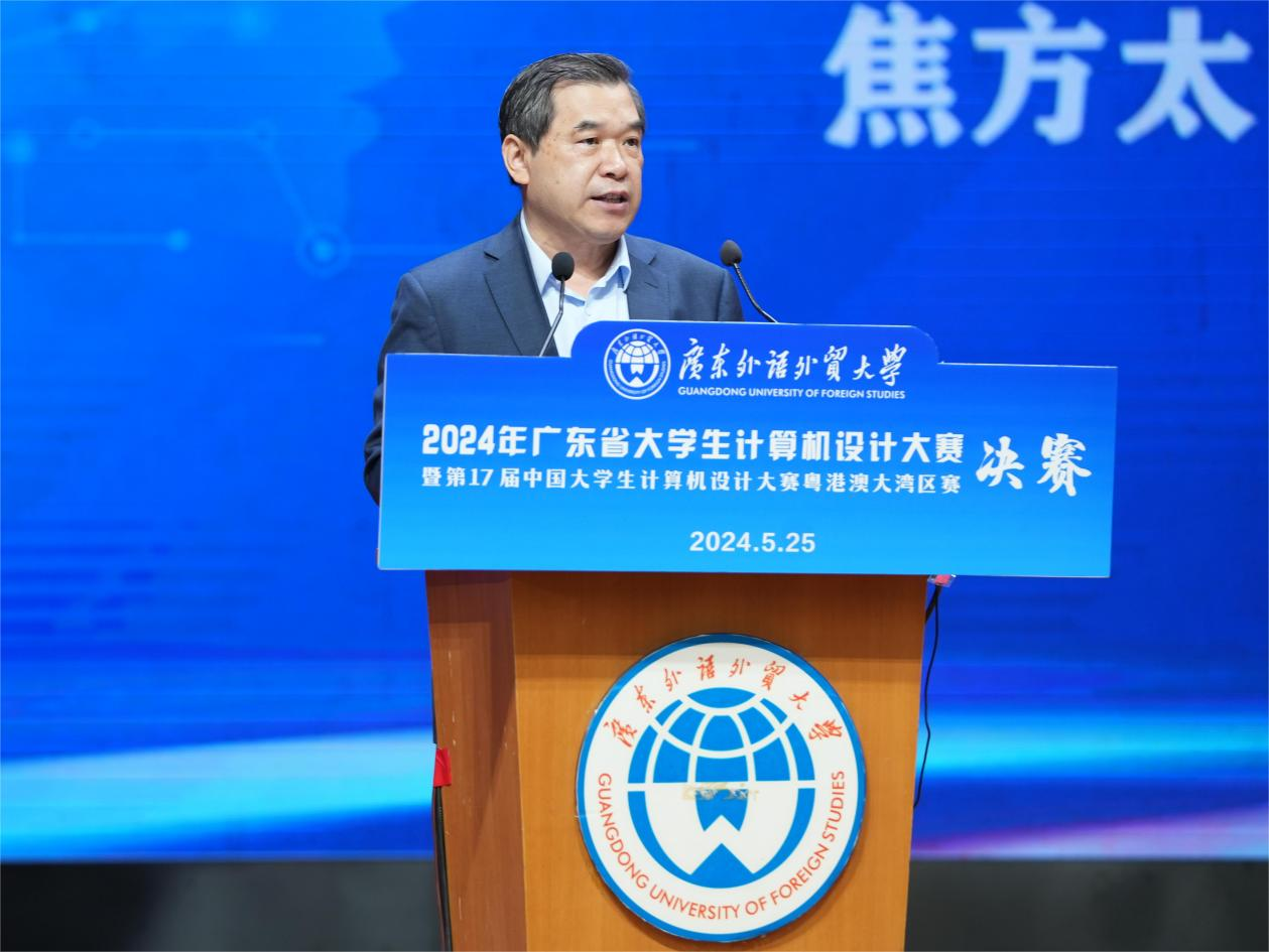 我校校党委常委、副校长焦方太在欢迎辞中指出,广东外语外贸大学作为一所具有国际化特色的高水平大学,长期致力于培养具有社会责任感和创新意识的高素质信息科学技术人才。今年是我校第九次承办大赛,来自粤港澳大湾区138所高校的5102件作品参与了校内选拔赛,参赛师生近2.5万人。他代表学校对教育厅的信任表示感谢,对全体参赛师生的到来表示热烈欢迎,并预祝大赛圆满成功。