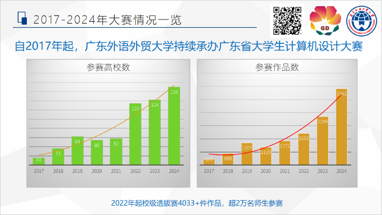我院李宇耀博士代表组委会介绍了今年省赛的总体情况,对作品类别、评审方案和评审平台的使用方法等相关事宜进行了说明。他还梳理了广外自2017年承办大赛以来参赛高校、作品和类别的数据,参赛高校从61所增加到138所,参赛作品数则激增了5倍以上。2024年,除了广外主赛场之外,还设置了11个分赛场,赛事规模空前。