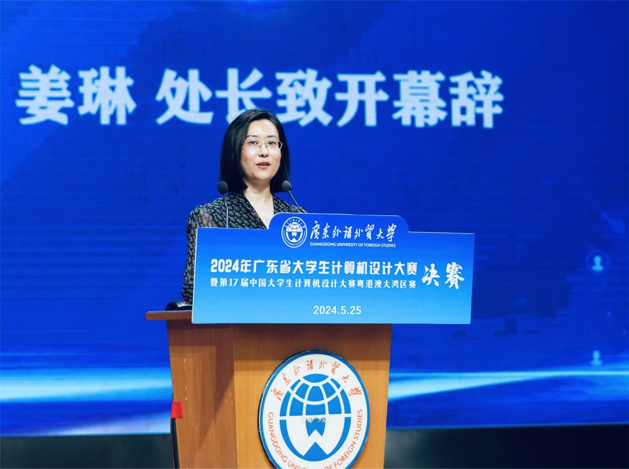 广东省教育厅高等教育处处长姜琳致开幕词。她以当前席卷全球的人工智能浪潮为切入点,从服务国家战略和区域经济发展的角度出发,指出教育行业正面临着重大变革。国家正大力推进人工智能产教平台的发展,清华大学等重点高校纷纷成立了人工智能学院。广东省在人工智能领域积极发展,去年底出台了《关于加快建设通用人工智能产业创新引领地的实施意见》。姜琳强调,高等院校要大力推进人工智能核心课程的建设,同时积极探索人工智能+人才培养模式,锐意改革进取,丰富教学内容,培养跨学科复合型人才。她指出,本次大赛与人工智能领域高质量发展、高层次人才培养相融相促、相得益彰,为人工智能+专业的交流提供了重要的平台和机遇。最后,她感谢承办方广东外语外贸大学和全体参赛师生的辛勤付出和不懈努力,希望本次大赛能展示出优秀的成果,通过比赛促进学习和教学,为广东省计算机人才培养注入新活力。