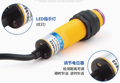 传送带包含一个光电传感器,用于检测物料是否到达检测位置。传感器为常开型,检测距离不大于30cm。如图4所示。
