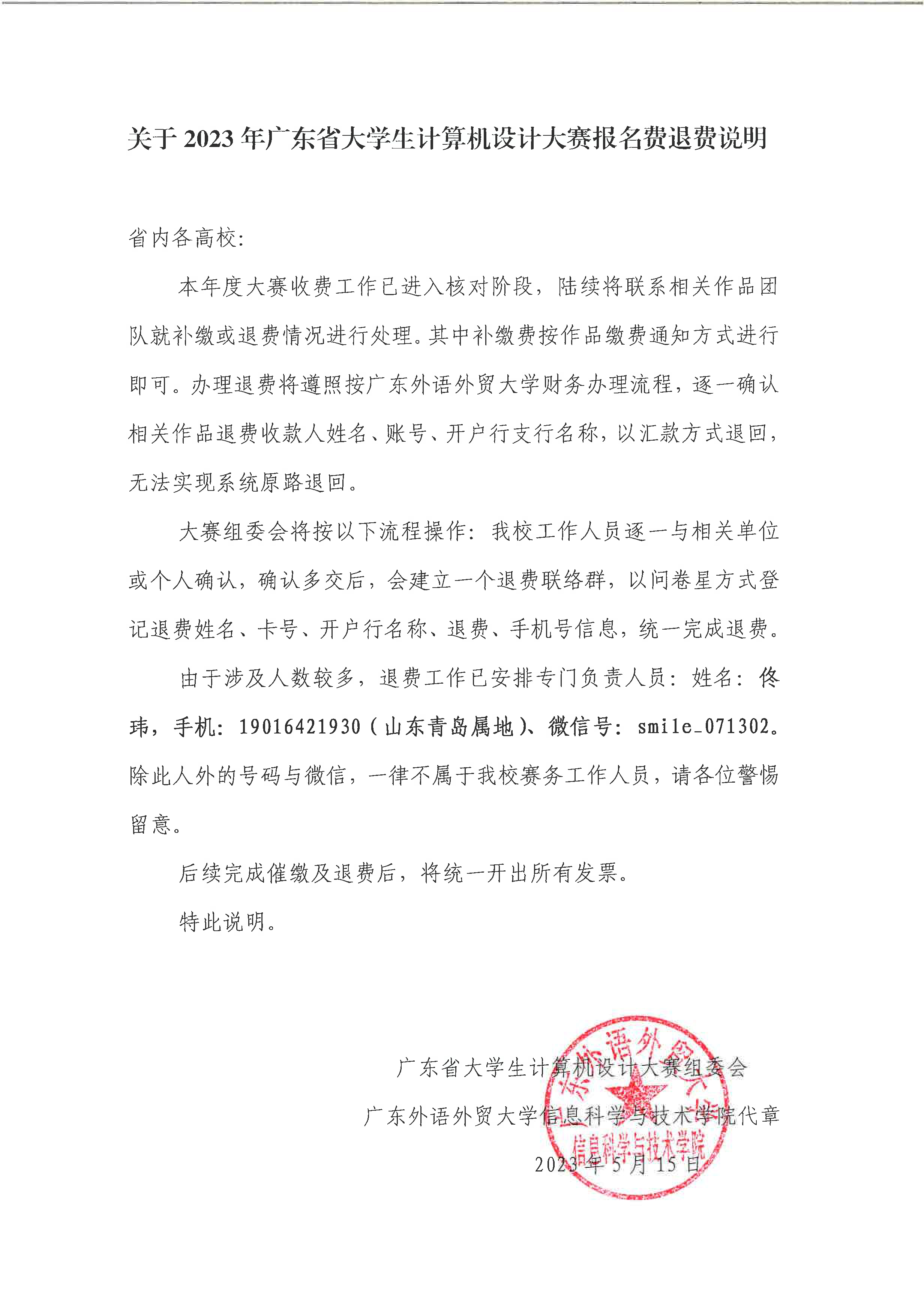 由于涉及人数较多,退费工作已安排专门负责人员:姓名:佟玮,手机:190****1930(山东青岛属地)、微信号:smile_071302。除此人外的号码与微信,一律不属于我校赛务工作人员,请各位警惕留意。