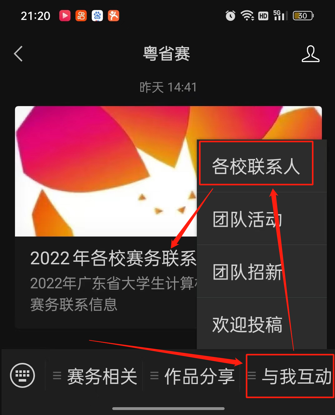 各校赛务联系老师信息,可循以下路径查找:粤省赛公众号à与我互动菜单à各校联系人,如下图所示: