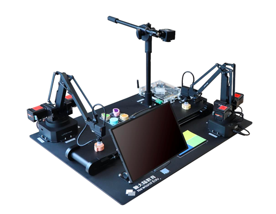 机器人底座、嵌入式AI核心开发板、桌面 级四自由度机械臂、语音采集播放设备、 高清显示屏、摄像头、机械臂端末配件、 传送带套件、色块配件。 |