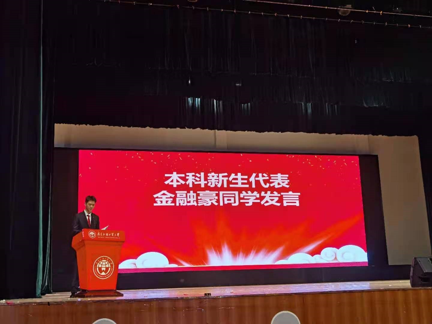 到本科新生代表金融豪发言时,他表达了自己对大学生活的向往,下定决心不虚度大学四年美好光阴,始终坚持求学奋斗。他还向同学们推荐了求学奋斗路上的三件法宝:其一,是要靠自己的基础和知识存量;其二,是要依靠老师、父母、同学;最后就是要有充足的自信。