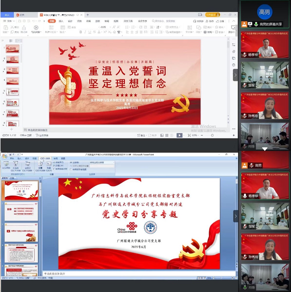 结对共建聚合力,党建引领促发展。6月24日下午,信息学院与中国联通广州分公司共建“云签约”仪式暨党史学习教育在线上举行,为即将到来的建党百年献上了一份特别的祝福。