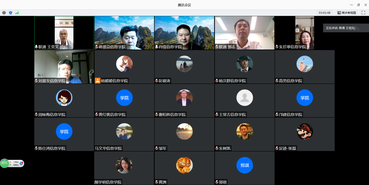 6月24日下午,我院与中国联通举行线上党组织共建和业务对接活动,中国联通广州市分公司黄埔区分公司总经理王奕文、副总经理苏小柳、广州联通政企客户事业部大数据中心主任汪旭、联通智慧足迹数据科技有限公司大区总监朱树凯、联通智慧足迹数据科技有限公司售前总监张磊、联通大数据公司工程师黄洲等参加交流。我院党委书记朱珍葶,院长蒋盛益,党委副书记肖锋,副院长谢柏林、王常吉,各系部主任和学生团队指导老师共同参与了线上会议并讨论技术合作相关事宜,会议由肖锋主持。
