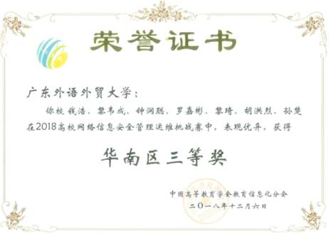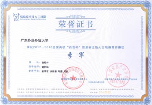 2018年全国高校“西普杯”信息安全铁人三项赛(广东赛区)第三名(一等奖)