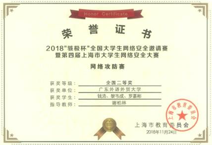 2018年第十一届全国大学生信息安全竞赛华南分区赛第一名,总决赛二等奖